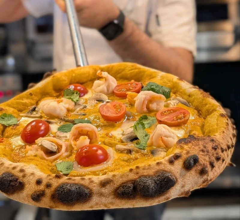 Сливки, Паста Том Ям, Моццарелла, Кокосовый крем, Креветки, Кальмар, Черри, Чили Перец, Кинза, Лайм сок, Шампиньон, Лемонграс.