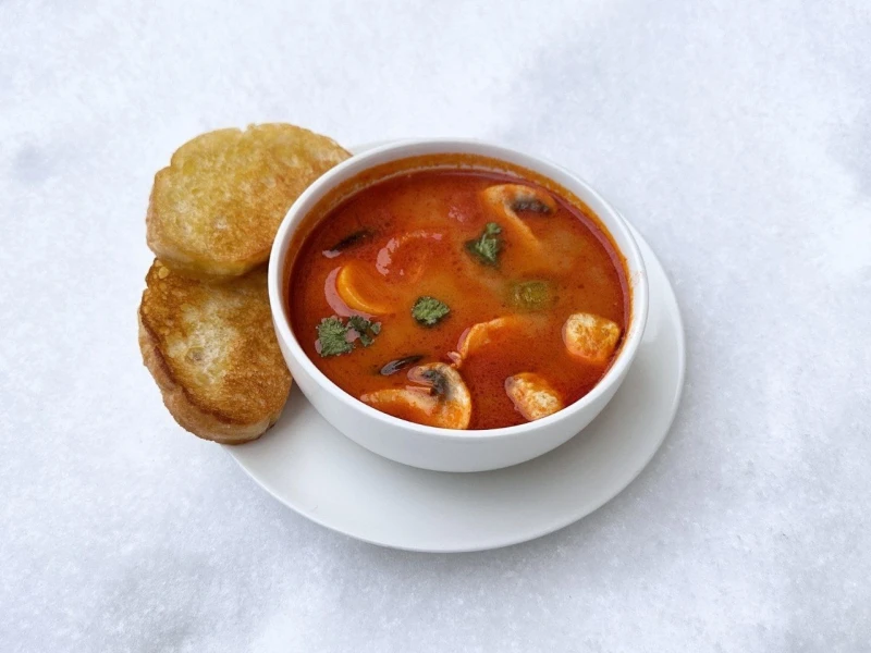 Паста Том Ям, Биск, Кокосовый крем, Креветки, Кальмар, Мидии, Черри, Чили Перец, Кинза, Лайм, Лист Лайма, Шампиньон, Лемонграс.